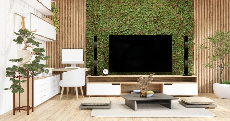 Вторым важным компонентом эко-интерьера принято считать растения. Живые настенные панели зеленого цвета, ампельные растения, деревья в горшках — все это добавляет в помещение не только природную красоту, но и свежесть. Растения создают атмосферу хорошего самочувствия, а также улучшают качество воздуха в помещении, увлажняя его и фильтруя вредные вещества.
