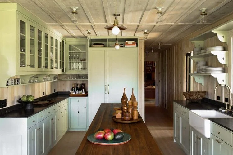 Воссоздать кухню звезды у себя дома несложно, если запастись банкой мятно-зеленой краски и если место позволяет – снять верхние шкафчики. Повесив вместо них открытые полки, вы сможете выставить на них любимую посуду, небольшие картины в рамках и горшки с растениями. Если у вас нет возможности заказать черные мраморные столешницы – не беда: роскошный материал, балансирующий деревенскую теплоту сырого дерева, можно включить в интерьер в виде ступок для специй или декоративных подставок. А добавить в интерьер тепла помогут сменные золотые ручки для мебели, которые можно купить в любом строительном магазине.