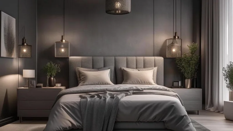 современная спальня в серых оттенках Источник фото: Создано: (ИИ) ПАО СберБанк©