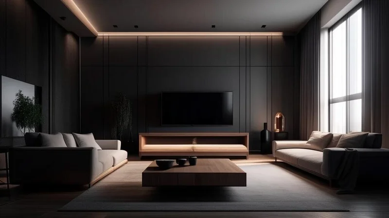 современная гостиная в серых оттенках Источник фото: Создано: (ИИ) ПАО СберБанк©