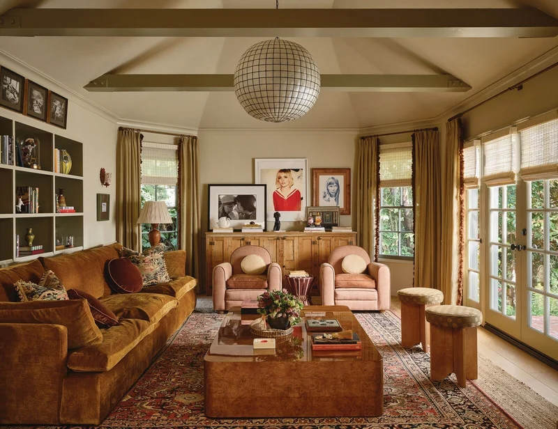 В этом духе большая часть мебели, предметов искусства и декора Робертс перепрофилирована или заменена обивкой. В гостиной, под лампой, похожей на диско-шар, в шкафах в гостиной расставлены книги в мягких обложках, в то время как более редкие книги выставлены на всеобщее обозрение. Фотографии Дебби Харри и Джони Митчелл в рамках стоят на деревянных полках, а на стене висит одно из самых ценных произведений искусства Робертс — портрет Джоан Дидион Джулиана Вассера на фоне Corvette.