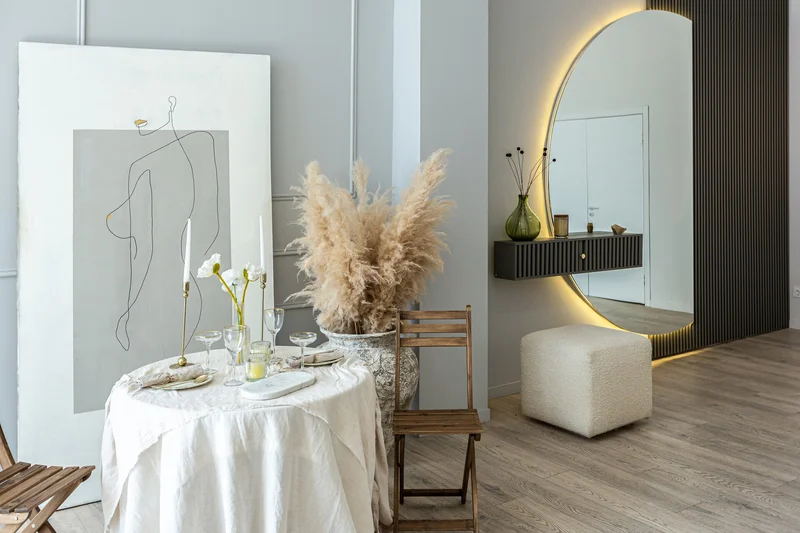 Большие зеркала: Они отражают больше света и пространства, создавая иллюзию продолжения комнаты. Для узких помещений, таких как коридоры, идеально подойдут зеркала во всю стену.