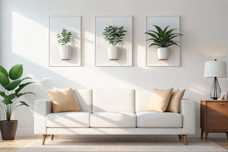 Стены можно украсить и с помощью комнатных растений. Интересная идея: разместить горшки в обрамлении рамок. Чтобы композиция получилась эффектной, постарайтесь, чтобы все горшки были одного цвета, размера и отделки. В таком оформлении растения выглядят, как ожившие картины. Можно поиграть с висячими растениями, чтобы придать композиции динамичности.