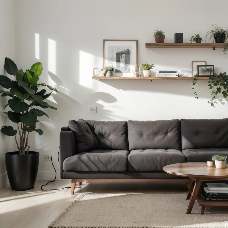 Воспользуйтесь стеной у дивана, чтобы расположить на ней полки. Единственное, о чем вы должны помнить, это о том, чтобы между полкой и спинкой было расстояние 20-30 см, чтобы вы не ударялись головой, когда садитесь.