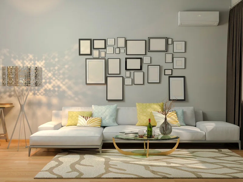 Композиция из пустых рамок на стене в гостиной. Источник фото: 123rf.com