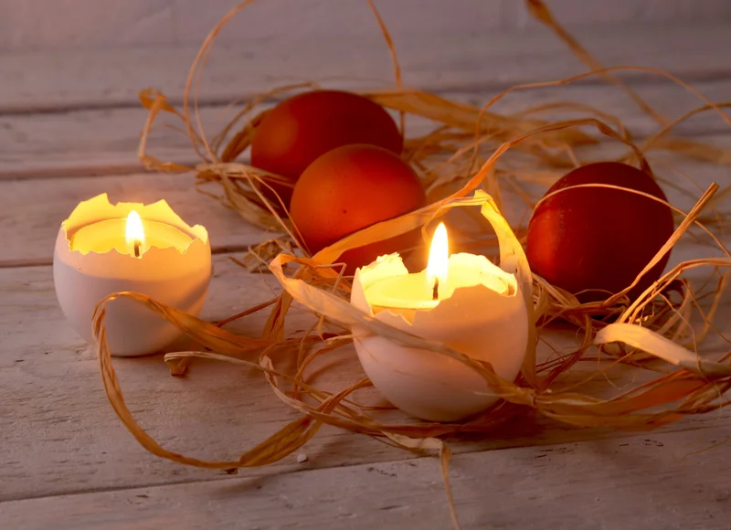 Если вы хотите приятно провести время с детьми, предложите им вместе сделать пасхальные подсвечники из яичной скорлупы: сварите яйцо вкрутую, сделайте небольшое отверстие в верхней части яйца и выньте содержимое маленькой ложечкой. Поместите внутрь фитиль, приклеив его на клей, и залейте расплавленный воск внутрь. Вы можете оставить свою свечку в раскрашенной скорлупе или очистить скорлупу после высыхания. Такие свечки будут прекрасным тематическим украшением праздничного стола.