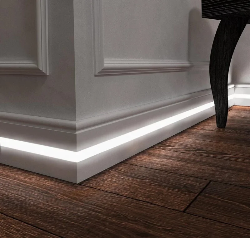 Плинтус из МДФ под светодиодную подсветку напольный Evrowood окрашенный белый Источник фото: lepninamilla.ru