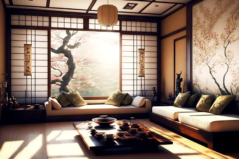Традиционными элементами оформления служат раздвижные перегородки, двери и ширмы, деревянная мебель, а также пастельная цветовая палитра. Большие окна и светопроницаемые перегородки обеспечивают обильное естественное освещение, что также является одной из ключевых характеристик японского дизайна.